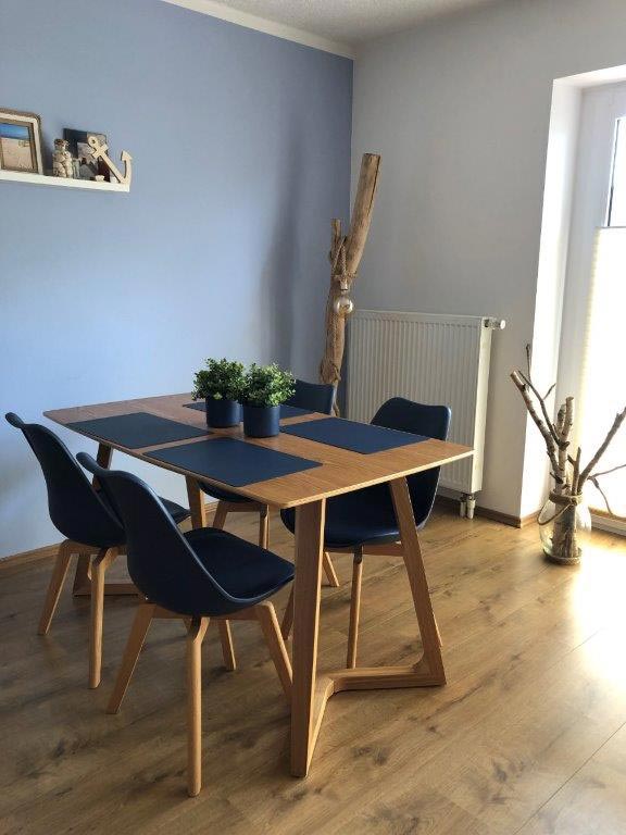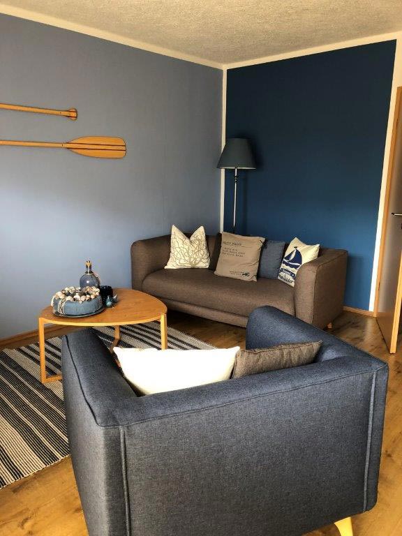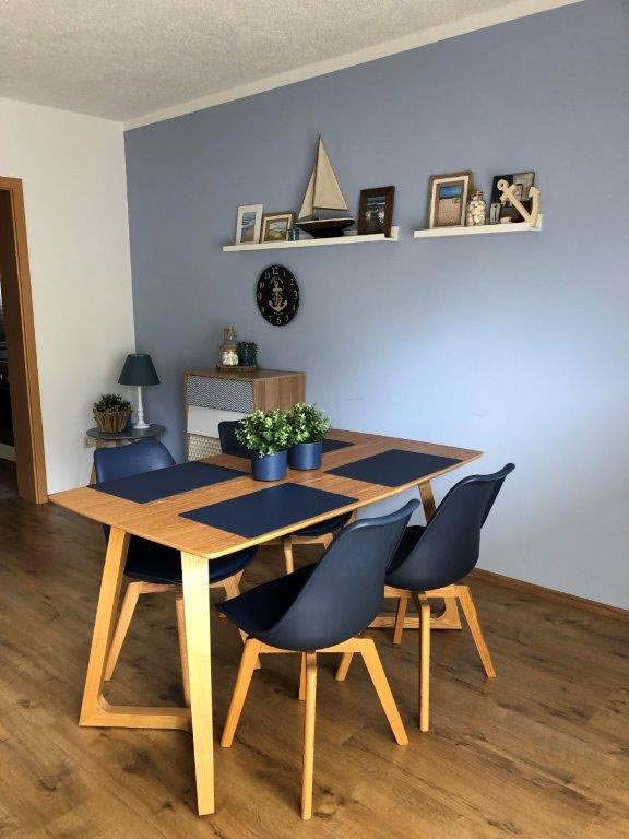 gemütliches Mobiliar, moderne TV-Anlage, großer Esstischtisch mit Sitzgelegenheiten für 4 bis 6 Personen